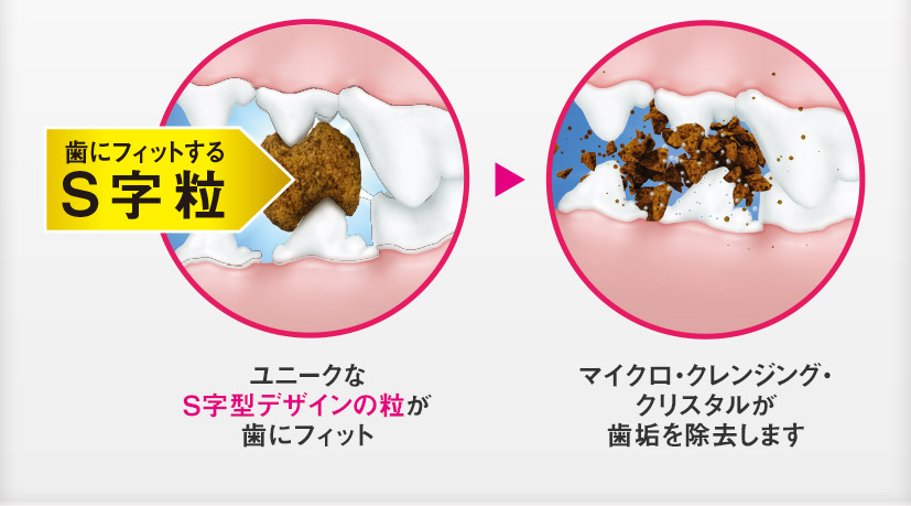 ミネラル成分マイクロ・クレンジング・クリスタルを配合したカリカリの粒を噛むことで歯垢・歯石の蓄積を抑えるサポートをします。